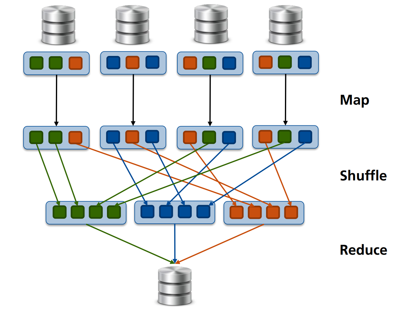 - Shuffle: Die Zwischenpaare (Key, Value) werden so auf neue Nodes verteilt, dass jeder Node alle Werte mit einem bestimmten Key erhält.