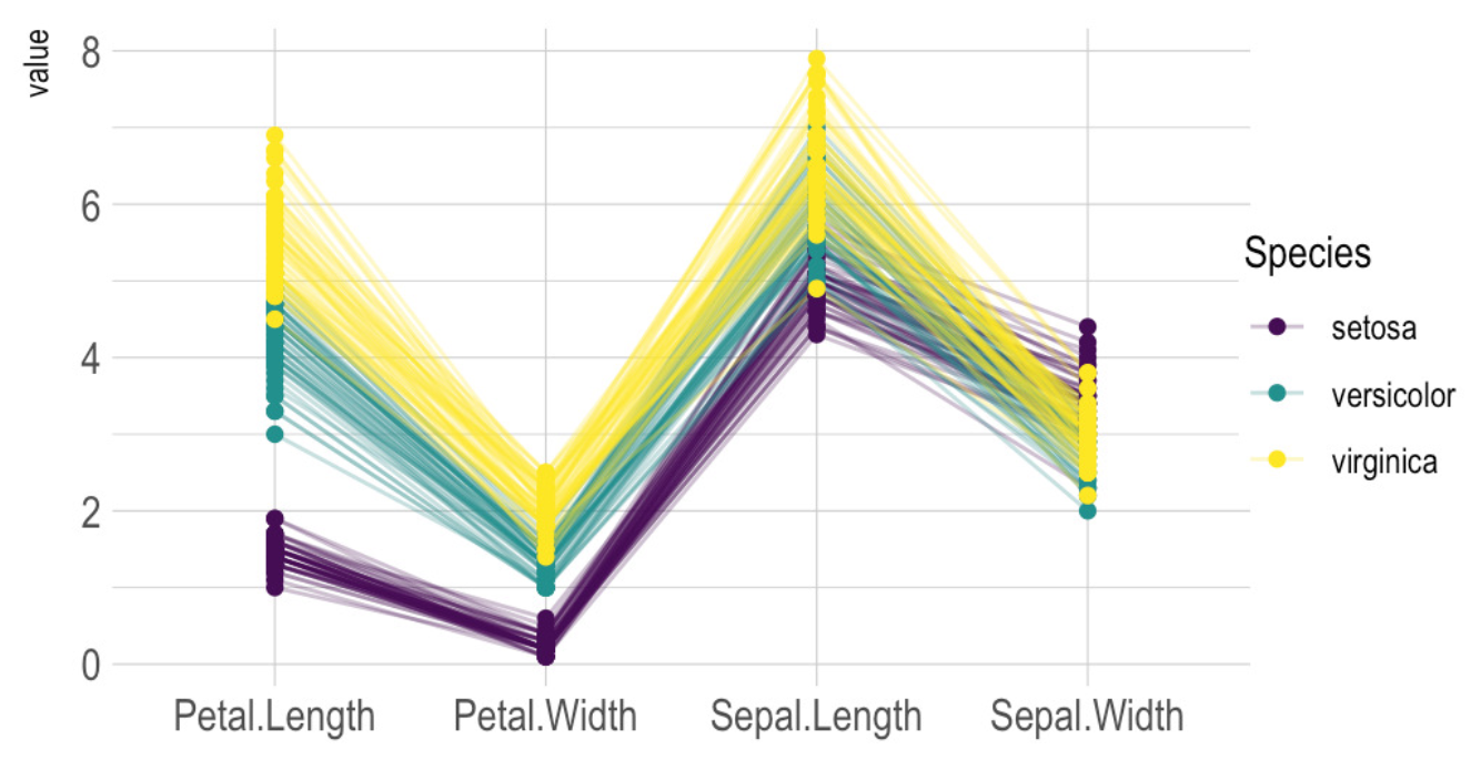 Als Parallel Coordinate Plot (kurz PCP) bezeichnen wir eine Darstellungsform, bei der jedem Attribut eine vertikale Achse zugeordnet wird.