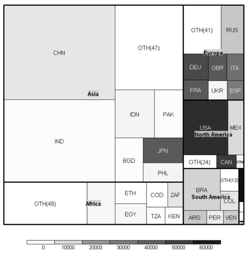 Die folgende Abbildung zeigt die Bevölkerungszahl durch den Flächeninhalt sowie das pro Kopf Bruttoinlandsprodukt in US-Dollar durch den Grauton der Kacheln: