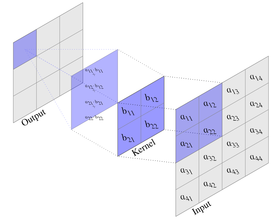 wird die Filtermatrix Schrittweise (en. Stride) über die Inputmatrix geschoben. In jedem Schritt wird das Frobenius-Skalarprodukt zwischen dem “überdeckten” Teil der Matrix