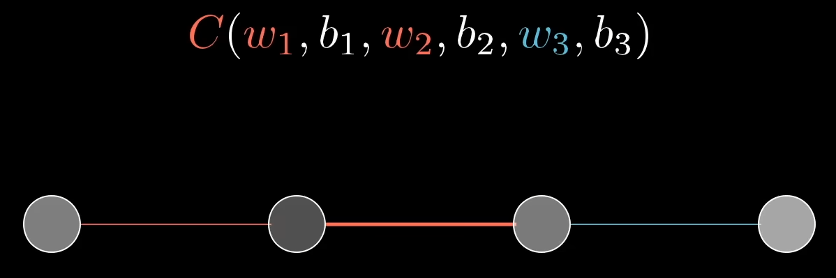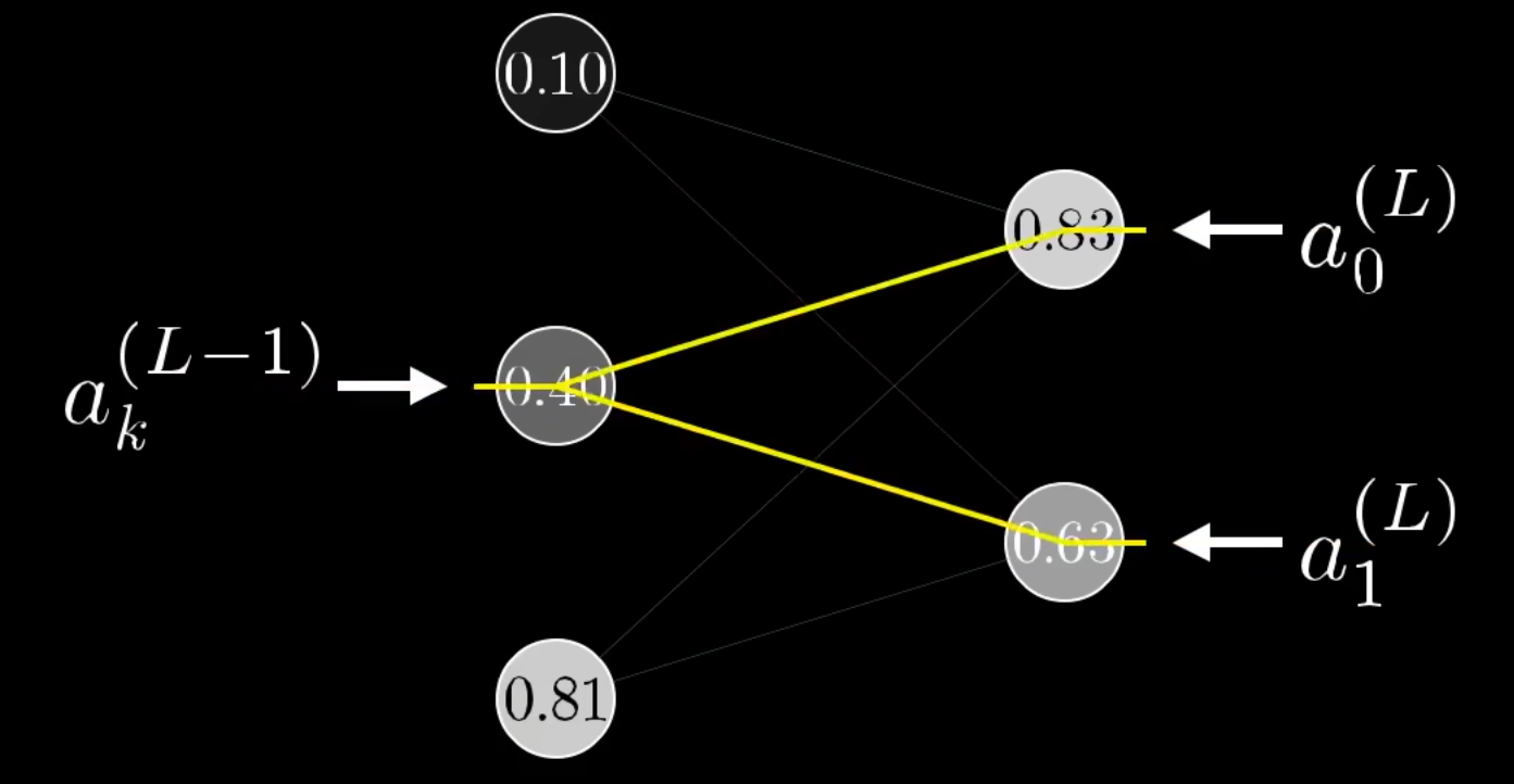 Für ein beliebiges Gewicht in einem beliebigen Layer müssen wir die Summe aller möglichen Einflüsse bilden, dazu benötigen wir für jeden Layer zwischen und der Ausgabeschicht eine Summation. Entsprechend komplex ist der Ausdruck: