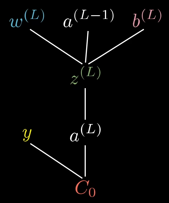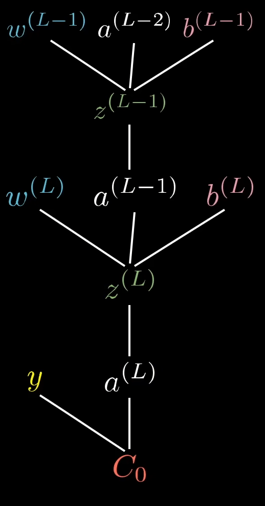 Wenn wir nun die Ableitung bezüglich benötigen, führen wir die Idee fort. Die Berechnung an dieser Stelle ist jedoch komplexer, da jedes Neuron einen Einfluss auf alle Neuronen in allen Folgeschichten hat: