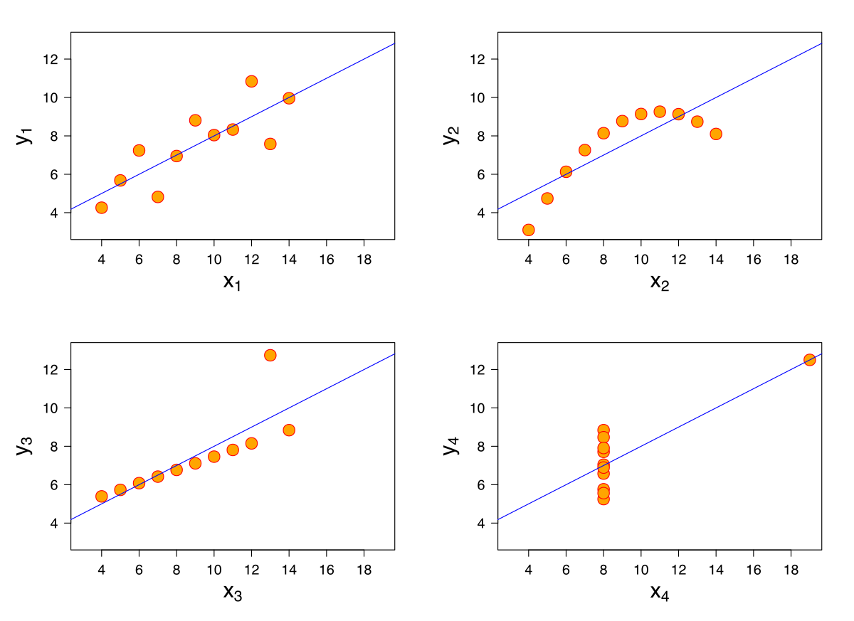 Als Anscombe-Quartett bezeichnen wir eine Gruppe von vier zweidimensionalen Datensätzen, die von dem Statistiker Francis Anscombe Anfang der 70er Jahre erstellt wurden. Die vier Datensätze haben zwar identische statistische Eigenschaften: