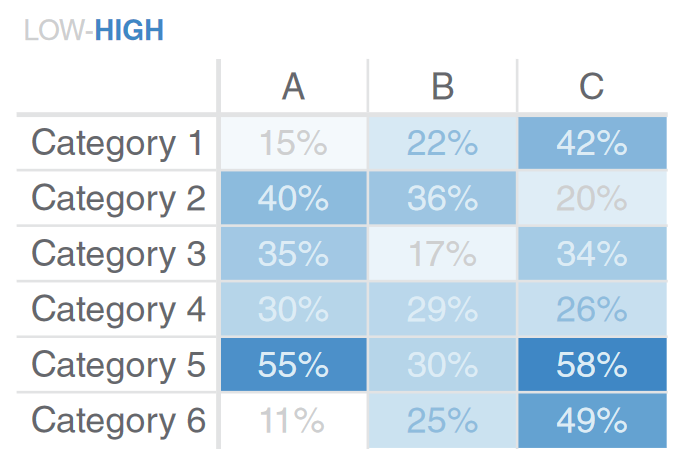 Als Heatmap-Diagramm bezeichnen wir besondere tabellarische Darstellungen, bei denen die Werte zusätzlich auf Basis ihrer Ausprägung hervorgehoben werden.