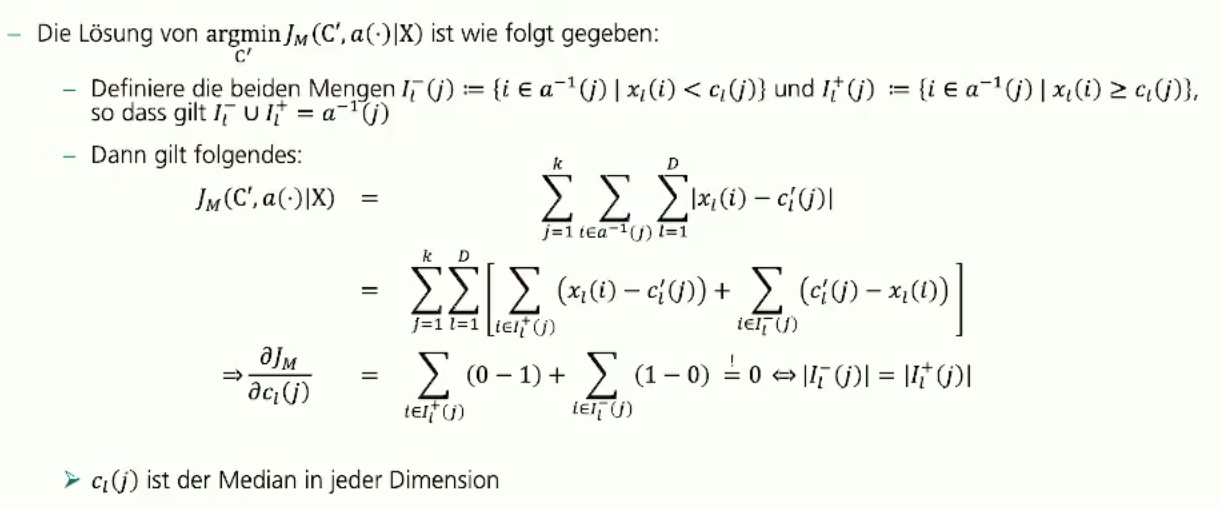 Während der K-Means-Algorithmus sich aus der Euklidischen Distanz ergibt, ergibt sich der K-Median-Algorithmus aus der Manhattan-Distanz. Davon abgesehen sind die Herleitungen identisch.