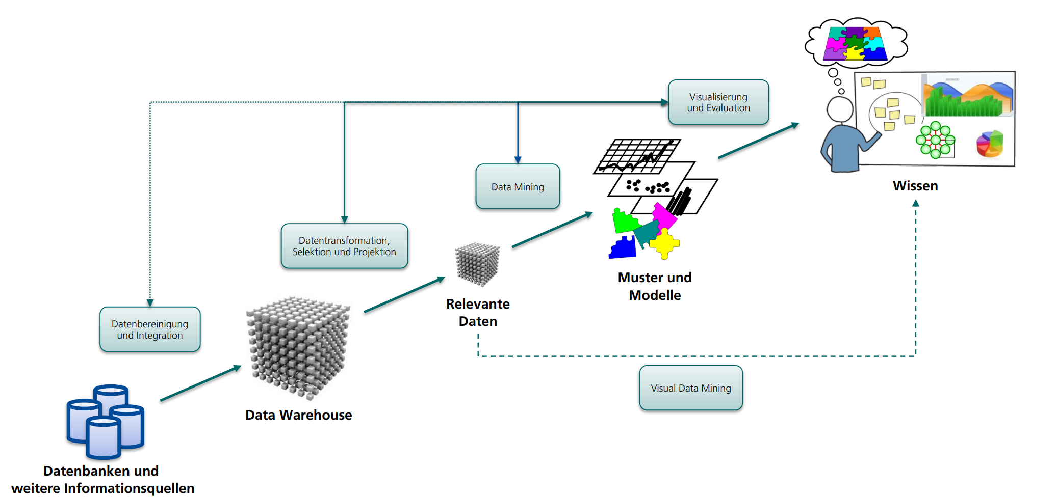 Da wir bei uns ein DWH in den Prozess eingebunden haben, unterscheiden sich die Schritte zu Fayyad etwas.