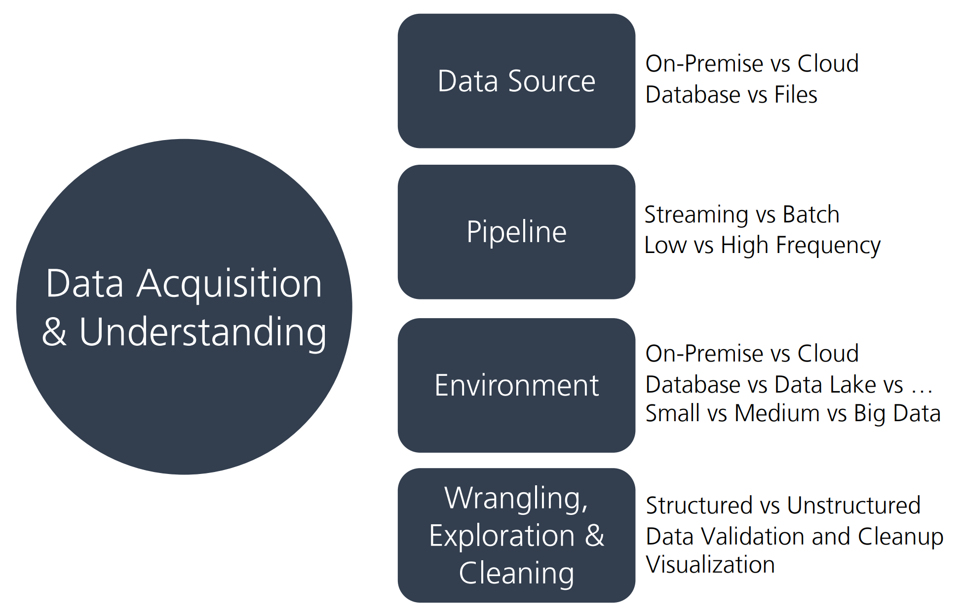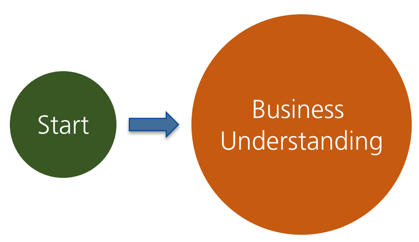 - Geschäftsverständnis: Definieren der Kriterien für den Projekterfolg, Bestimmung von Zielvariablen und zugehörigen Metriken und Identifikation der Datenquellen.