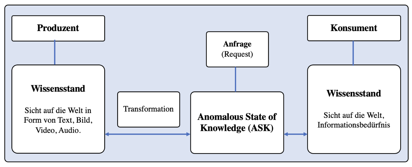 - Konsument: Hat einen abweichenden Wissenszustand (den Anomalous State of Knowledge), der sich in einer Frage/Anfrage manifestiert