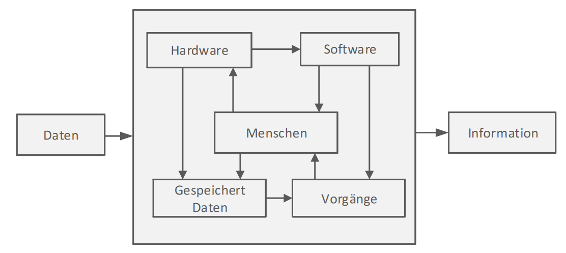 Ein Informationssystem besteht nicht nur aus Technologie, sondern umfasst auch Menschen, Geschäftsprozesse und Strukturen, die zusammenarbeiten, um Eingaben in nützliche Ausgaben zu transformieren und so spezifische Ziele zu erreichen. Es ist zudem in seine Umgebung eingebunden und interagiert mit anderen Systemen und Elementen.