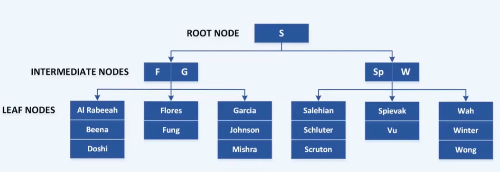 Jeder Knoten eines B-Baums enthält mehrere Schlüssel und Zeiger auf Teilbäume, die jeweils bestimmte Wertebereiche abdecken. Zu jedem Schlüssel kann außerdem ein Wert gespeichert werden.