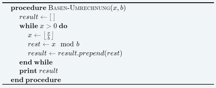 \begin{algorithm} \begin{algorithmic} \Procedure{Basen-Umrechnung}{$x, b$} \State $result \gets [\ ]$ \While{$x>0$} \State $x\gets \left\lfloor{\frac{x}{b}}\right\rfloor$ \State $rest\gets x \mod b$ \State $result \gets result.prepend(rest)$ \EndWhile \Print $result$ \EndProcedure \end{algorithmic} \end{algorithm}