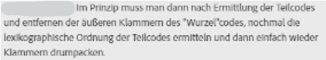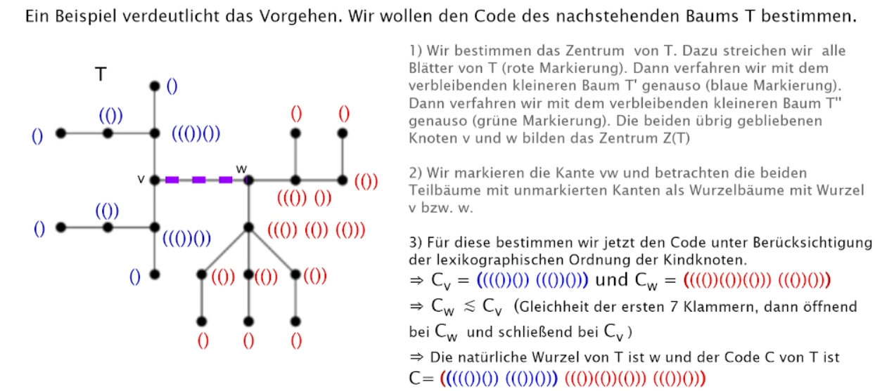 und konkatenieren. Dabei müssen wir jedoch darauf achten, dass die äußeren Klammern anders gesetzt werden müssen. Die kanonische Wurzel “verliert” ihre unmittelbaren Klammern. Diese umschließen jetzt nämlich den gesamten Code des Baums. Sei