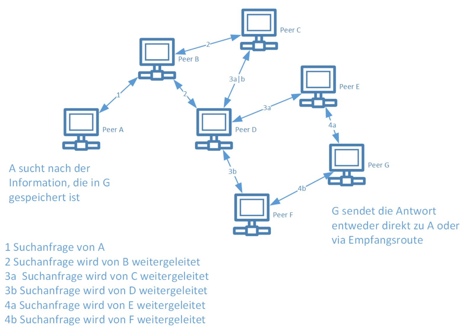 Erhält der Peer A eine Query, so leitet er diese an die mit ihm verbundenen Peers weiter, die ihrerseits ebenfalls versuchen, die Query zu beantworten. Hierzu prüfen sie einerseits ihr internes IRS und leiten die Anfrage andererseits an ihre verbundenen Peers weiter. Nach der Verarbeitung werden die Antworten an den Peer A zurückgeleitet und von A zusammengeführt.