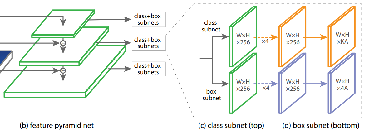Die Regression-Heads erhalten jeweils eine Featuremap aus dem FPN (also P3, …, P7) als Input - in der Illustration des Heads ist das der erste grüne Layer.