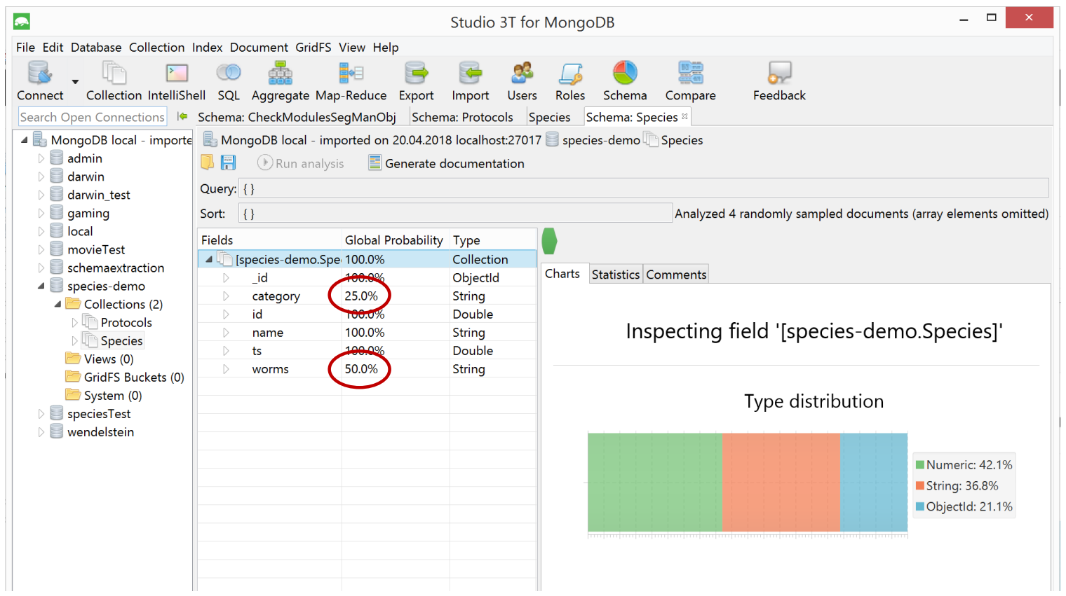 Hier ein Beispiel für Schemainspektion (Reverse Engineering) mit Studio 3T für MongoDB: