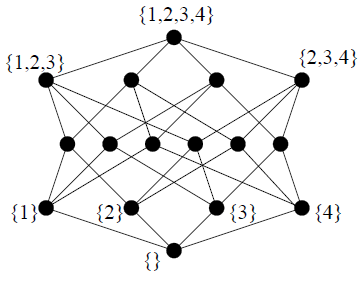 Das folgende Hasse Diagramm stellt die Teilmengenrelation der Potenzmenge von