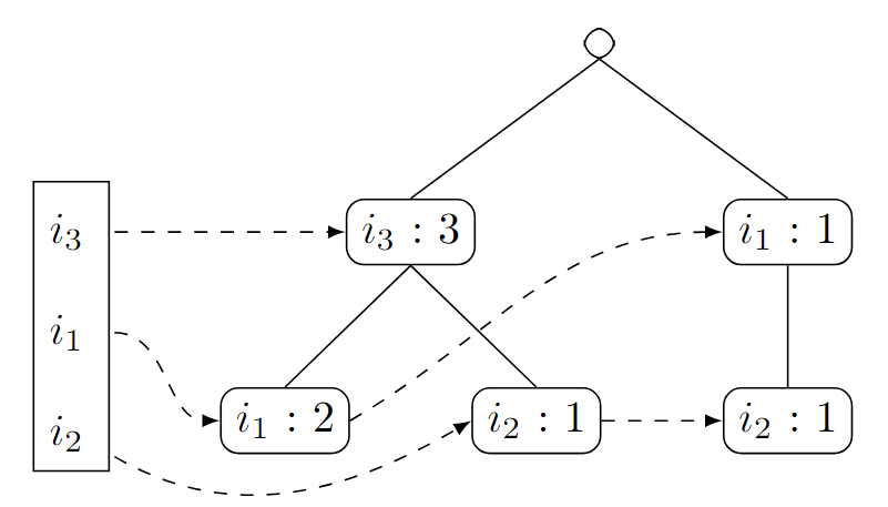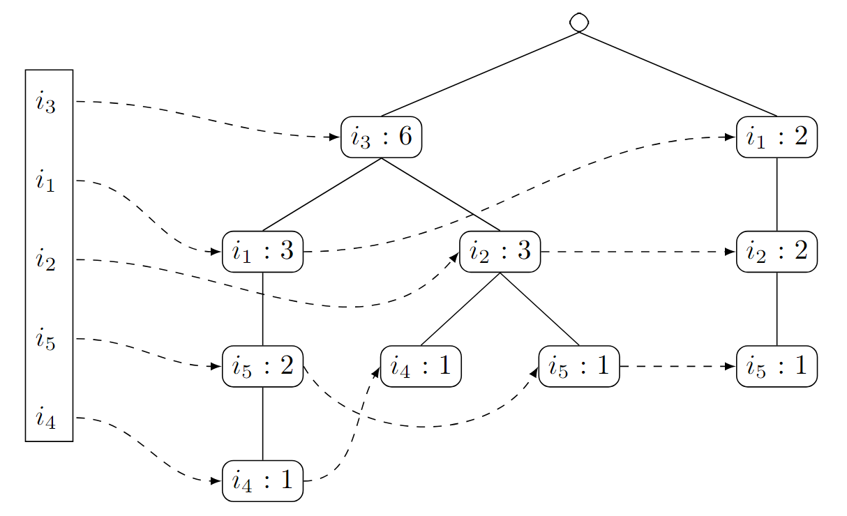Seiein Transaktionsdatensatz über . Als FPGrowth-Algorithmus zum Auffinden häufiger Itemsets bezeichnen wir folgenden Algorithmus: