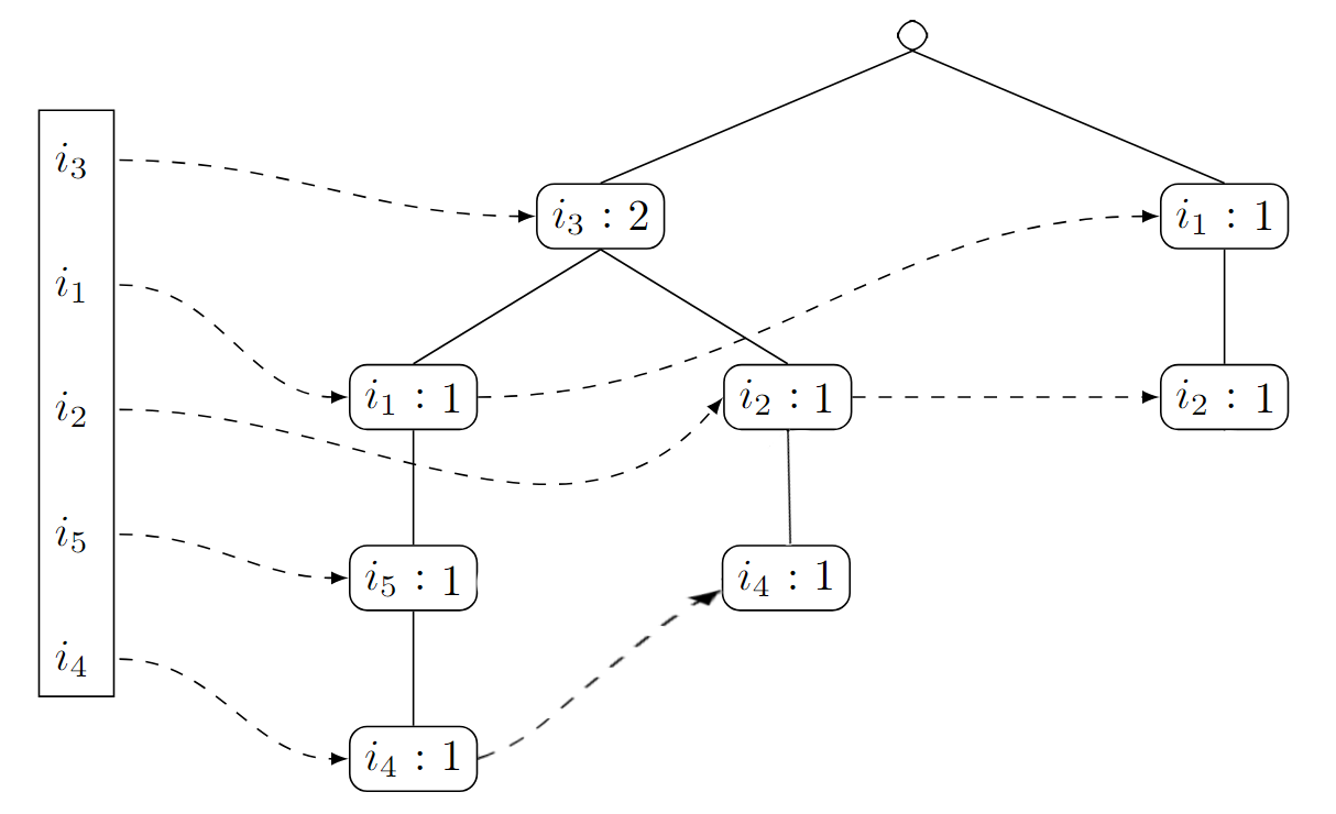 Um den FPTree-Algorithmus im weiteren Verlauf auch für den FPGrowth-Algorithmus nutzen zu können, müssen wir uns neben dem Baum selbst auch noch merken, in welcher Reihenfolge die Knoten angelegt wurden.