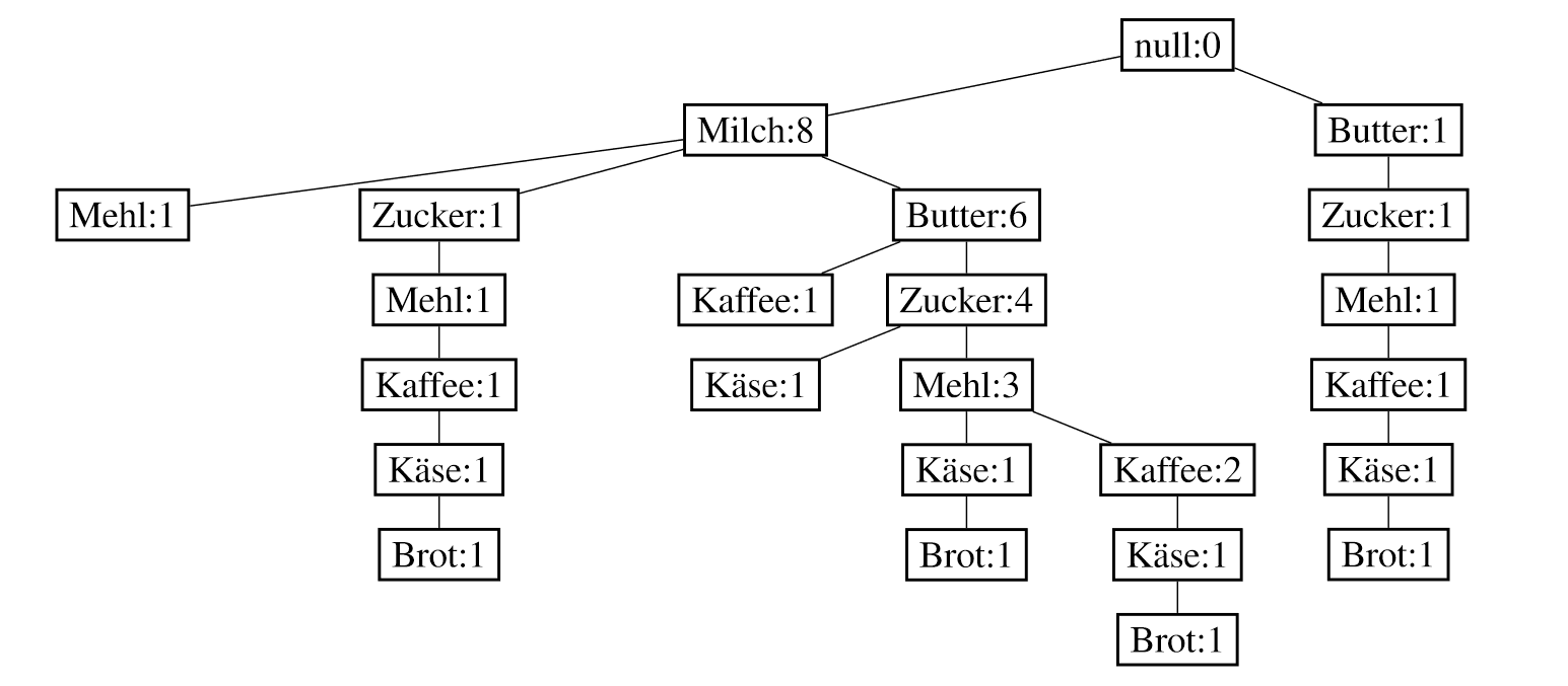 gibt es einen eindeutigen Pfad zu . Die folgende Illustration zeigt einen FP-Baum über der Menge