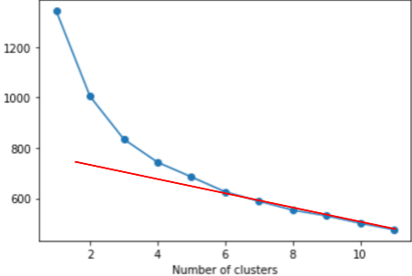 In der Praxis sind Elbow-Plots sehr uneindeutig. Eine Linie anzulegen, wie in der folgenden Illustration, kann helfen: