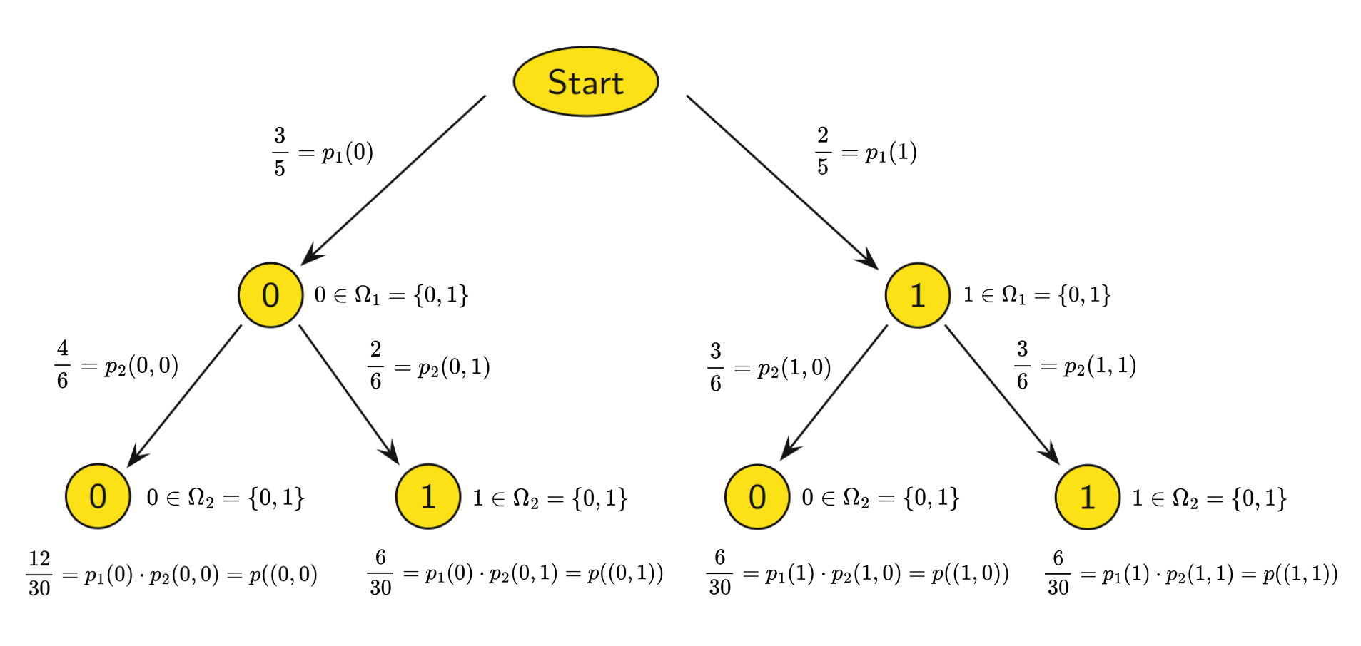 der Grundraum eines aus Teilvorgängen bestehenden stochastischen Prozesses. Jeder Knoten (mit Ausnahme der Wurzel) repräsentiert dabei ein Ergebnis